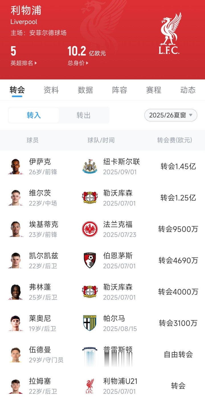 利物浦夏窗引援↓
